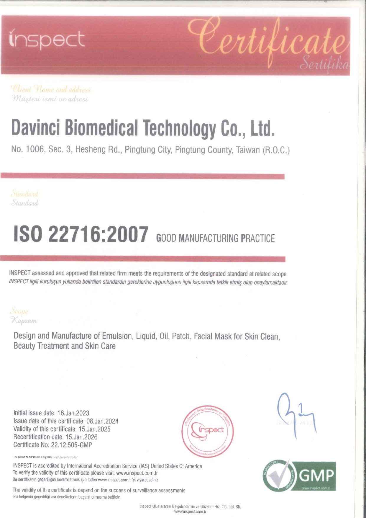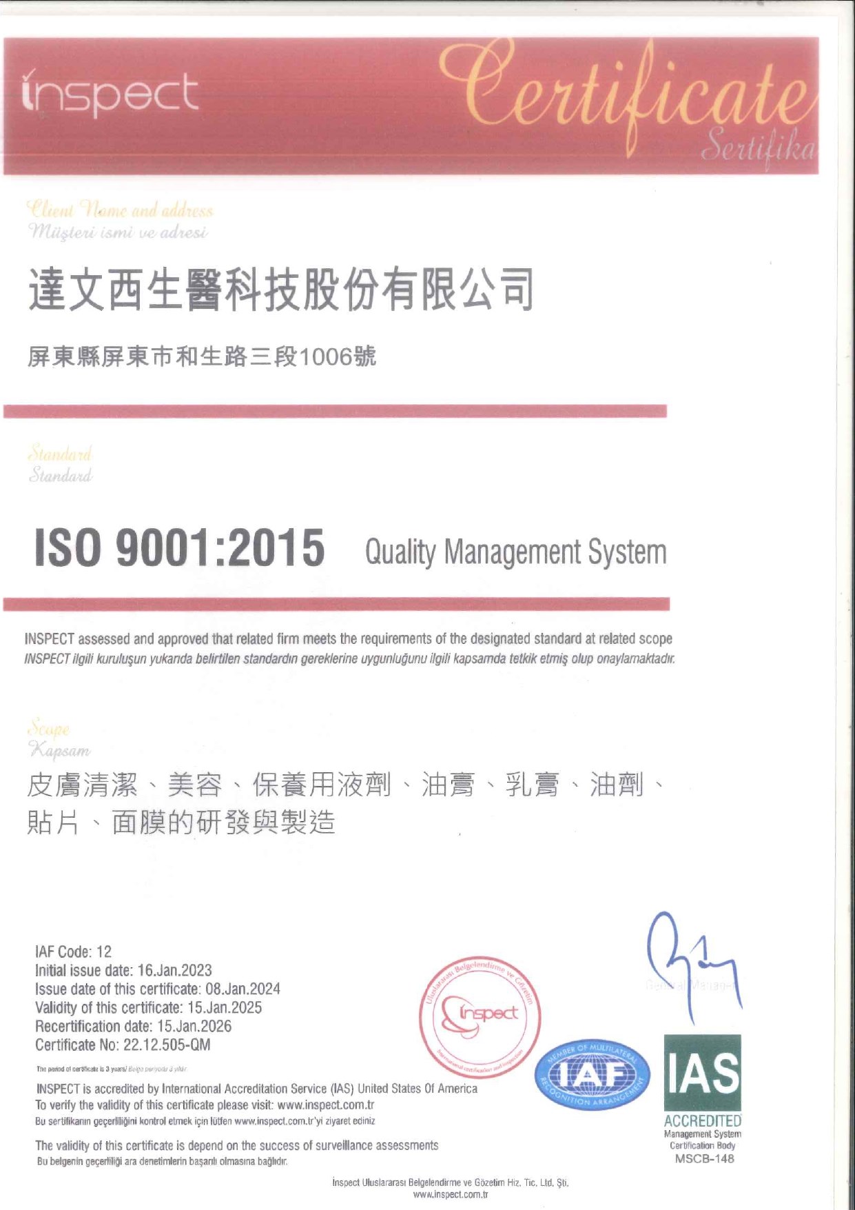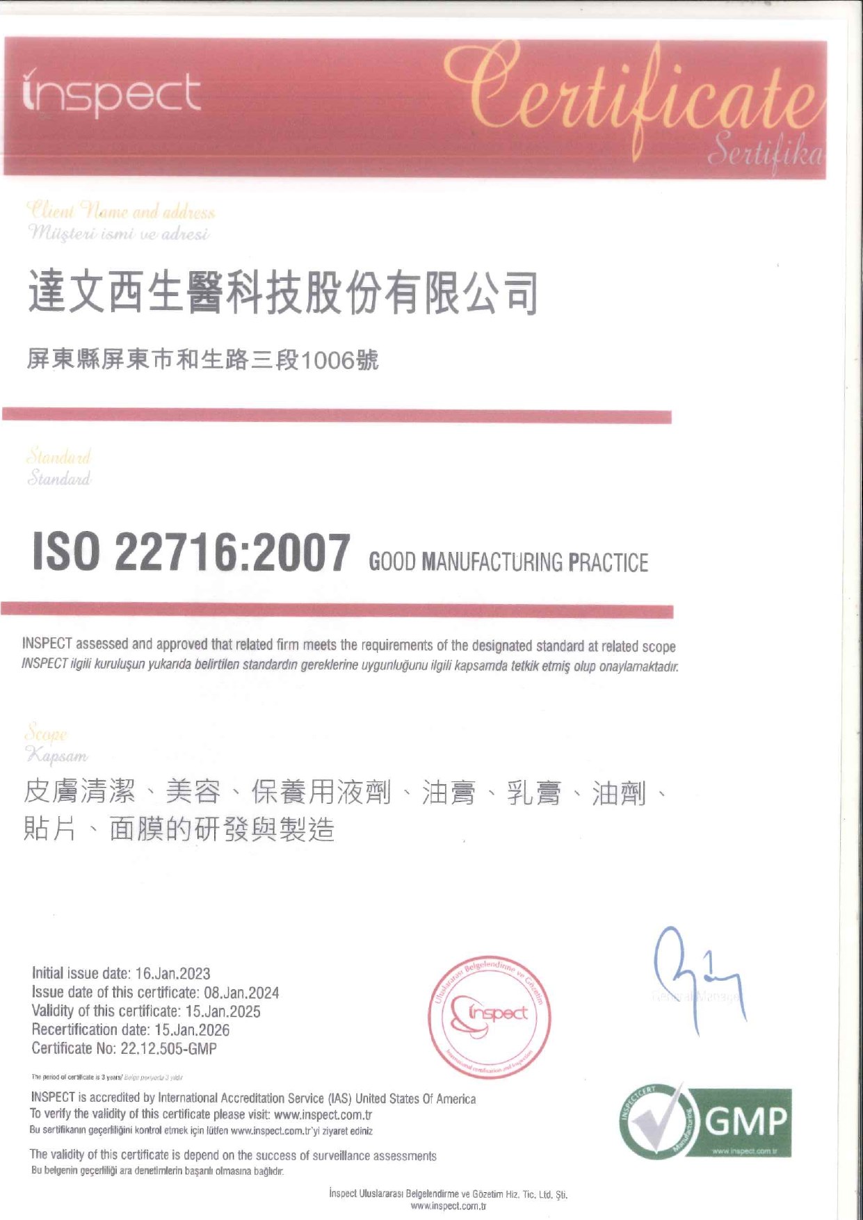 本公司通過ISO9001:2015國際品質管理系統認證與ISO22716:2007化妝品優良生產規範。